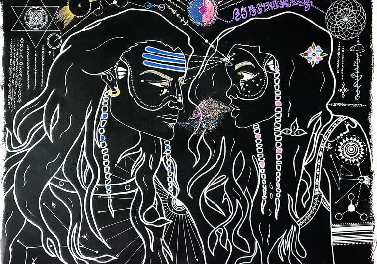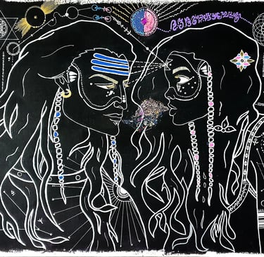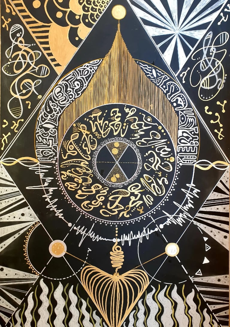 Kyaron's multidimensional artistry transcends traditional boundaries, inviting viewers to explore their cosmic origins through sacred geometry and intuitive expression.